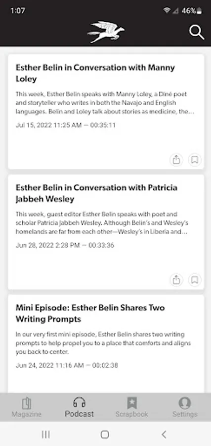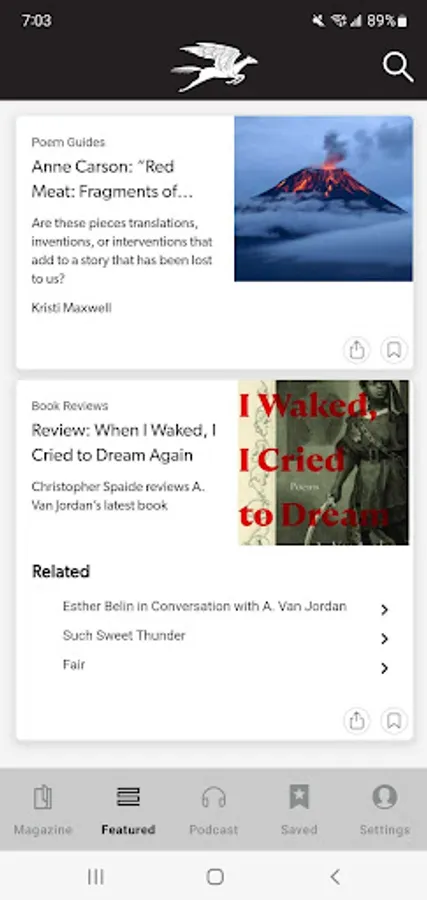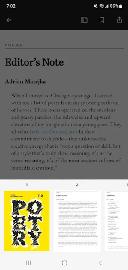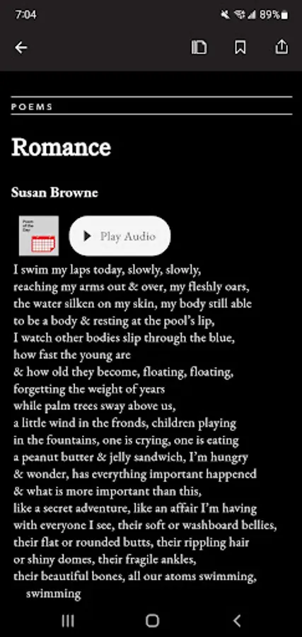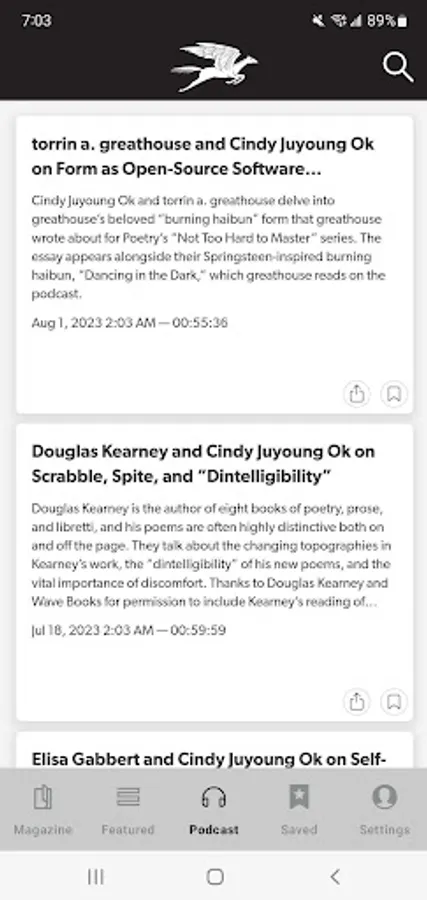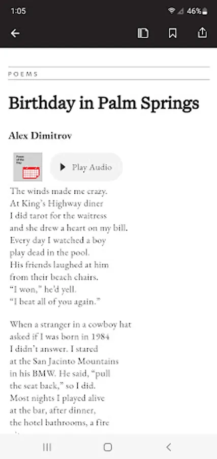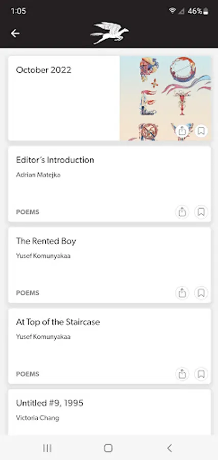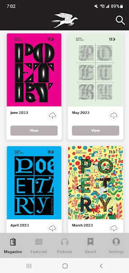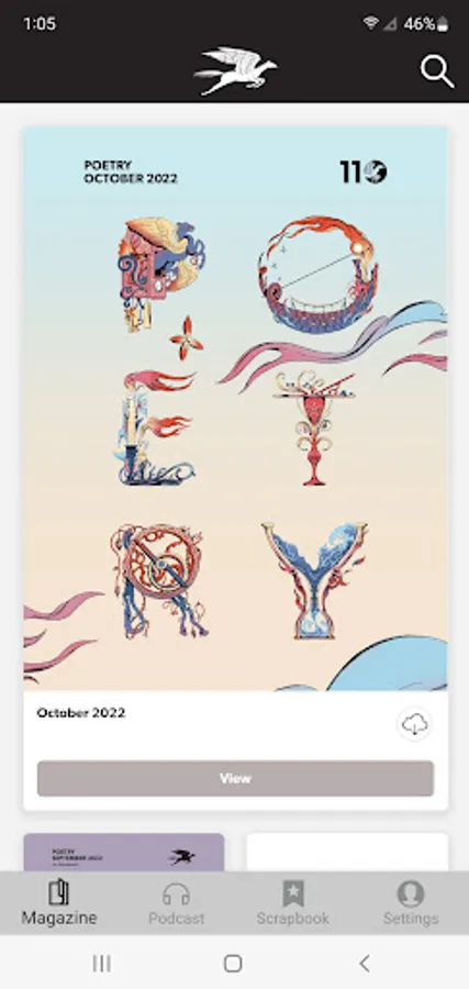 POETRY magazine has been a monthly gathering space for poets and readers for over a century. The POETRY Magazine app delivers all the poems, prose, and special portfolios found in the monthly print edition of POETRY, plus exclusive digital extras, such as podcasts, fresh looks at archival content, and contributor essays. It also allows you to save your favorite poems and prose in each issue.