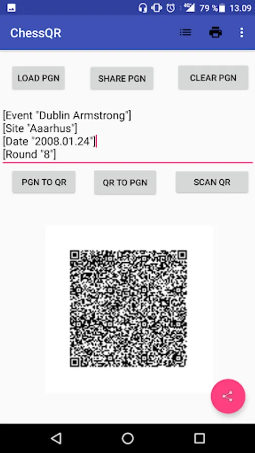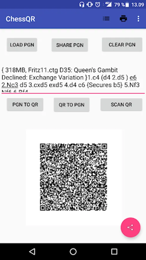 This app can convert chess PGN files to a QR code and vice versa. You can print the QR codes or share them with other people as well. You can also share the converted PGN chess file with other people.