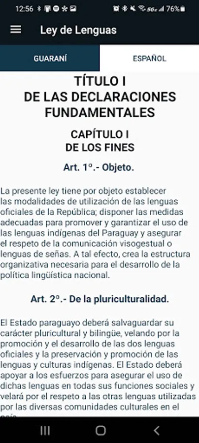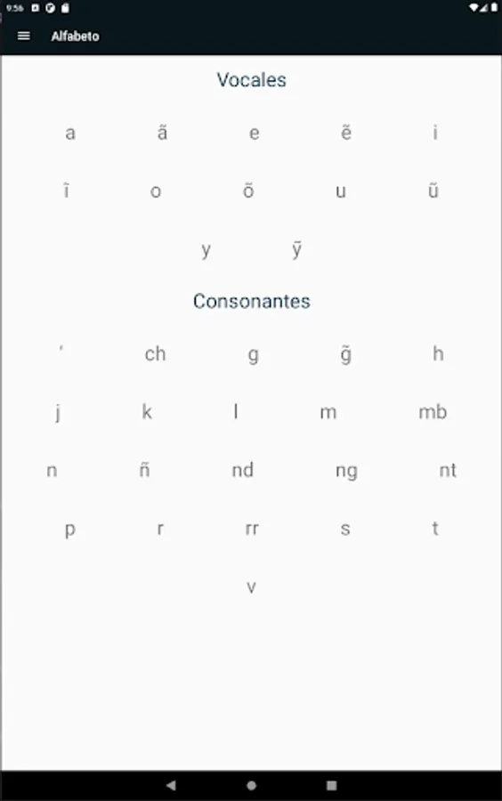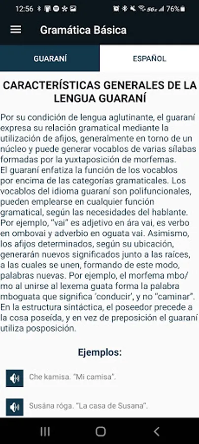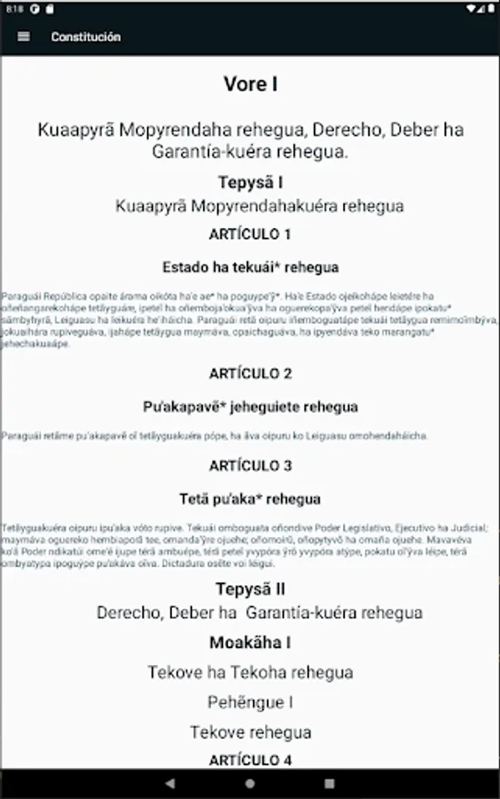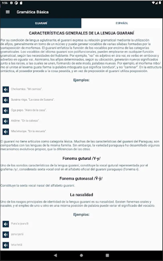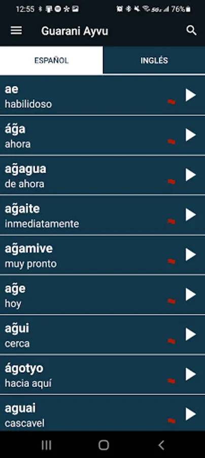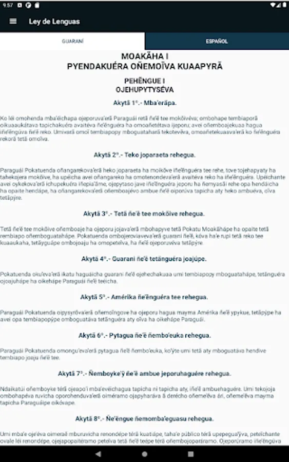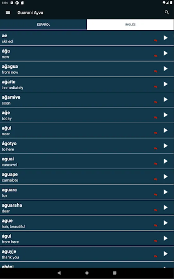 Guarani Ayvu is a free app for Android phones and tablets with 3,200 Guarani words translated to Spanish and English with Guarani audio pronunciations. Additionally, the app includes pronunciations of the Guarani alphabet, basic grammar information, basic medical phrases, as well as the constitution and key language laws translated to Guarani available with audio.