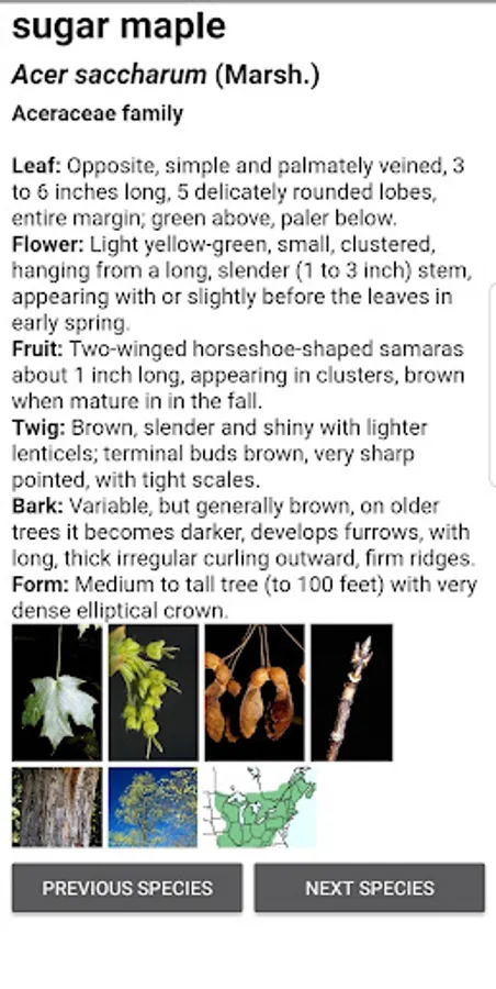 Users can further narrow the species list by answering a series of very simple tree attribute questions such as where the plant is growing, leaf shape, leaf arrangement, flower color or fruit type.