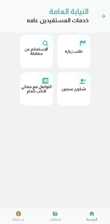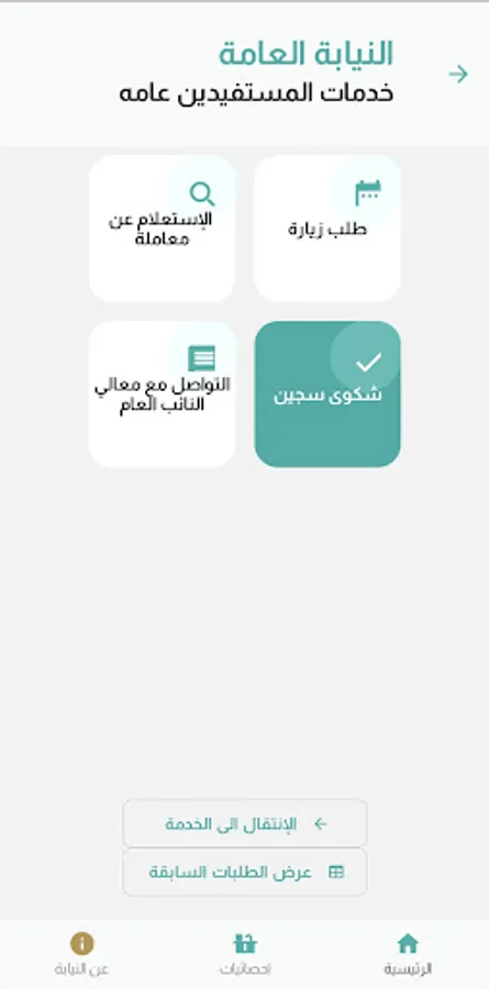 In view of the efforts of the Public Prosecution Office in the Kingdom of Saudi Arabia to facilitate the access of all beneficiaries, citizens and residents, to its electronic services. The e-services application has been released, through which it is possible to communicate with His Excellency the Attorney General, submit a visit request, inquire about a transaction and