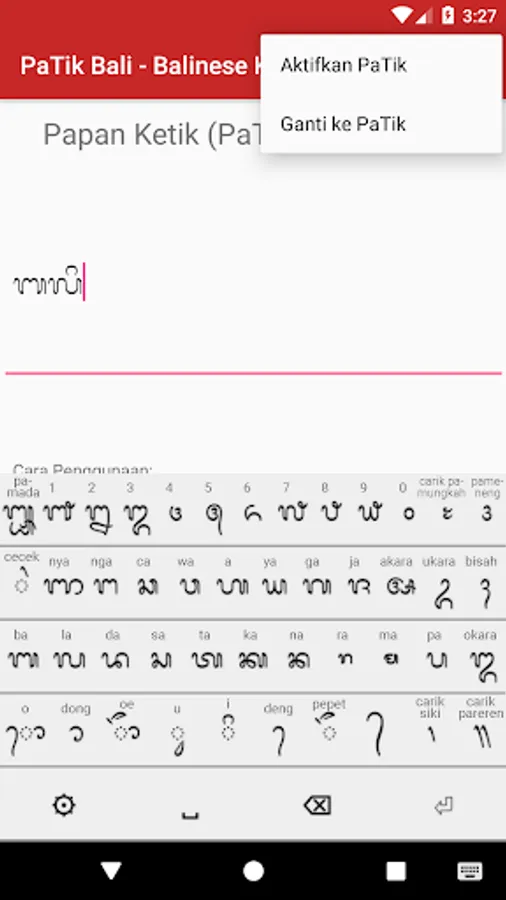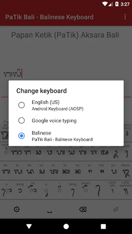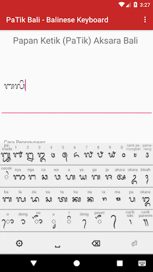 Keyboard script abbreviated slave Bali Bali is a Balinese alphabet keyboard to type in your android device. Balinese script has been recognized by the inclusion of Balinese script in UNICODE standard, however, the use of Balinese script has not been too much. The Balinese script with a keyboard you can type characters bali in any application, such as Whatsapp, Line, Telegram, Facebook, Tweeter, Instagram. This keyboard has been able to make improvements Wianjana Duplicate pairs of characters automatically.