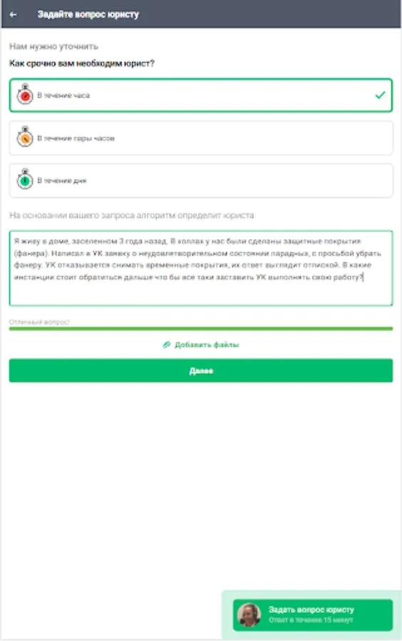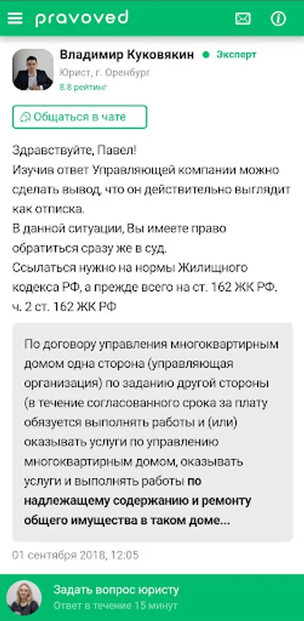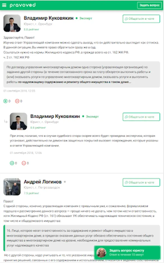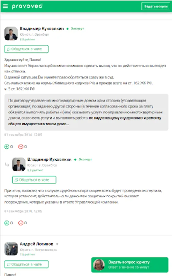 At Pravoved, you can quickly get legal advice online or by phone. Ask a question right now, and hundreds of professionals from all over Russia will see it.