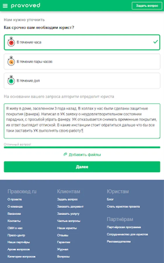 You ask a question and get several well-reasoned answers at once - the collegiate opinion of Pravoved lawyers eliminates the possibility of error.