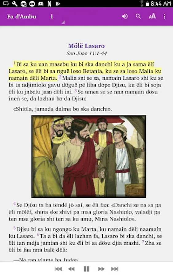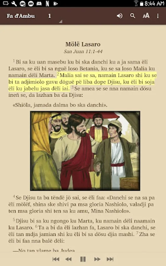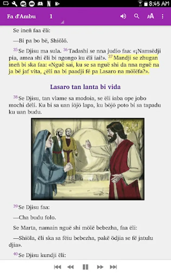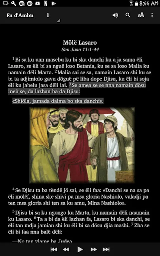 The story of Lazarus in the Bible, Fa d'Ambu Annobon, audio and pictures.