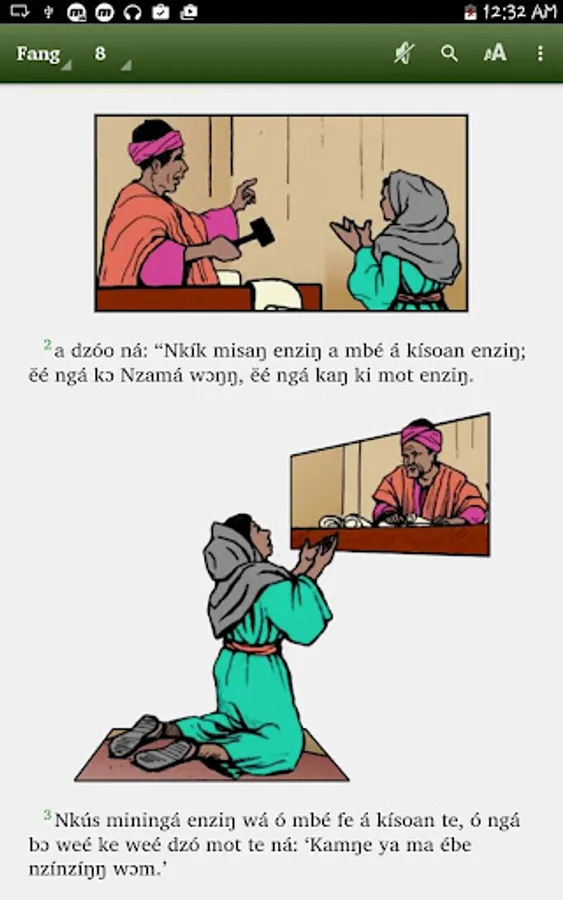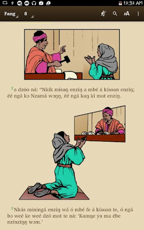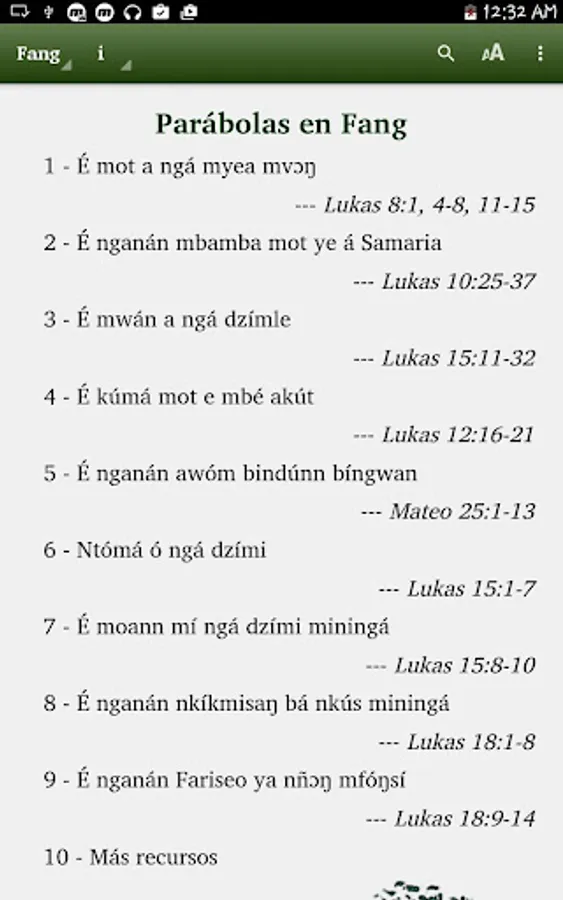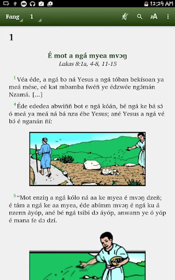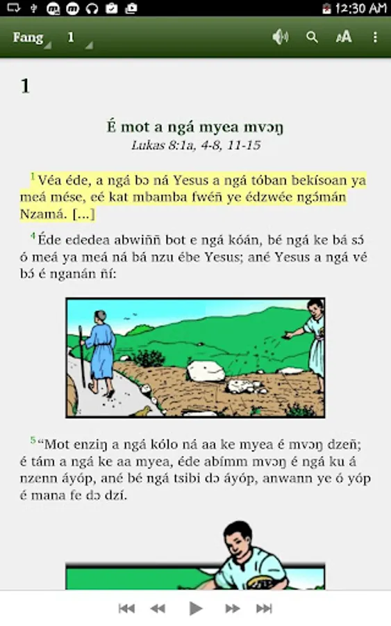 This application has the following nine parables of Jesus in fang (of EFIA Nzama © 2015, ACTB), Spanish and French: