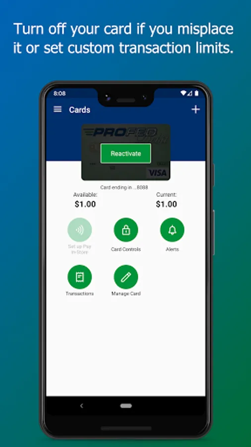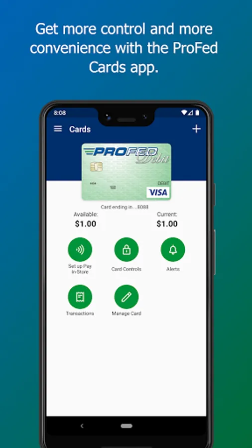 Use this app in conjunction with ProFed Online Mobile Banking app to get the most benefit out of your card.