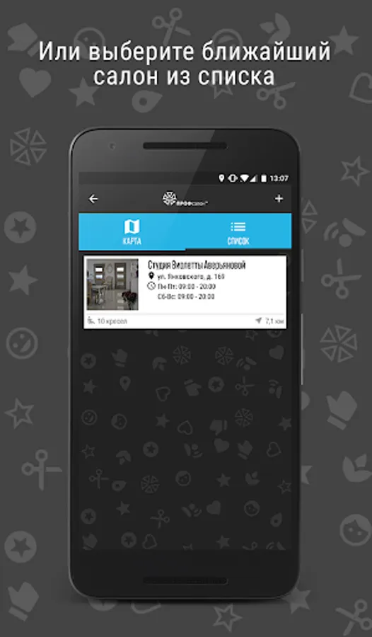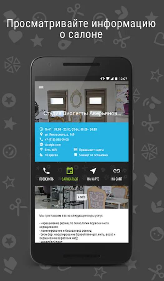 • View information about the salon - mode of operation, address and telephone number, interior photo