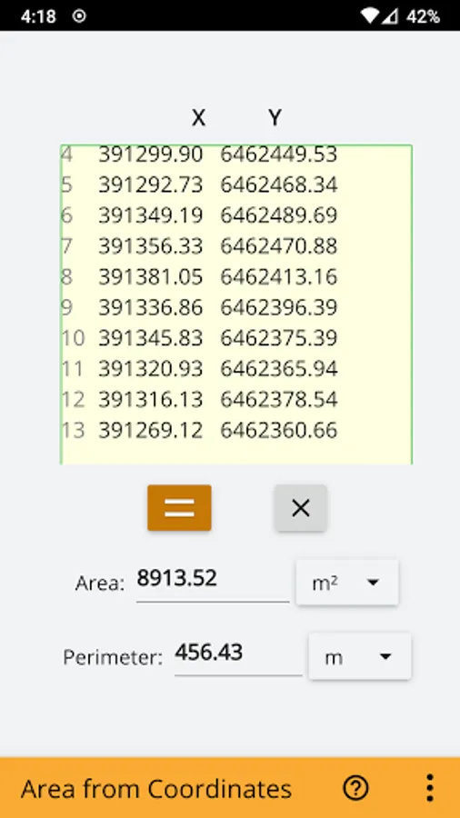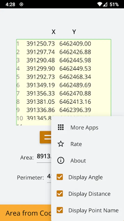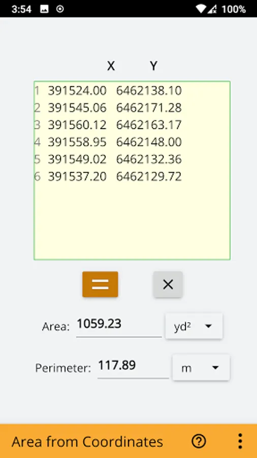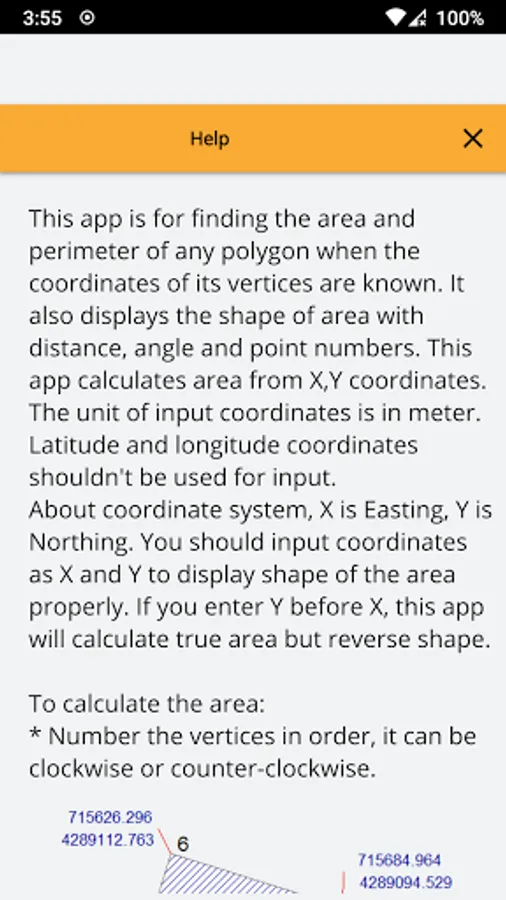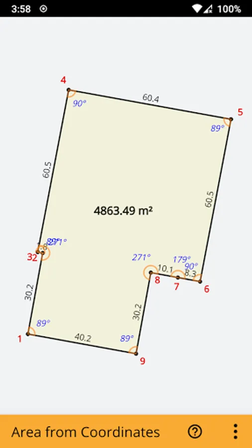 You can calculate and display area and perimeter from coordinates. You can also see point numbers, length of each side and angle of each corner on the shape of the area. To calculate the area, you number the vertices in order in clockwise or counter-clockwise. After writing the coordinates of area respectively, press calculate button to see the results. Below the calculation, you can see the shape of the area. It supports international units such as meter, yard, hectare, acre, feet.. Separator of input coordinate pairs should be space or comma.