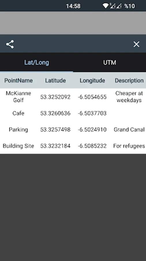 UTM Map displays latitude - longitude, MGRS and UTM X,Y coordinates on the map. You can see your coordinates or you can get coordinates of any place on the map. User can see the accuracy of the GPS, compass azimuth and compass on the map. It displays UTM zone in 6 degrees.The coordinates are based on WGS84 projection. You can store or delete a point. The app can navigate to a point, displays the distance in different units. You can display the list of coordinates in latitude, longitude and UTM. You can share your coordinates in latitude, longitude or UTM. It has a full screen mode to display the map full screen. You can get any coordinate information on anywhere on the map and you can save places.