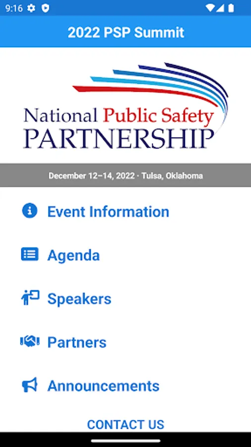 This is the official mobile application for the 2022 U.S. Department of Justice (DOJ) National Public Safety Partnership (PSP) Summit. The PSP Summit is a 2½-day, invitation-only event in Tulsa, Oklahoma, on December 12—14, 2022. The PSP Summit will convene executive leadership and key stakeholders from selected PSP sites to participate in focused discussions directly with DOJ representatives, including United States Attorneys, federal law enforcement agencies, and violence reduction subject experts. The summit will provide information on the broad spectrum of DOJ resources available to PSP communities and will provide a forum for site leaders to identify ways that DOJ can help enhance existing public safety efforts. This mobile application is funded through a grant from the Bureau of Justice Assistance (BJA), Office of Justice Programs, U.S. Department of Justice.