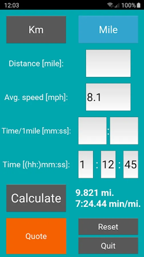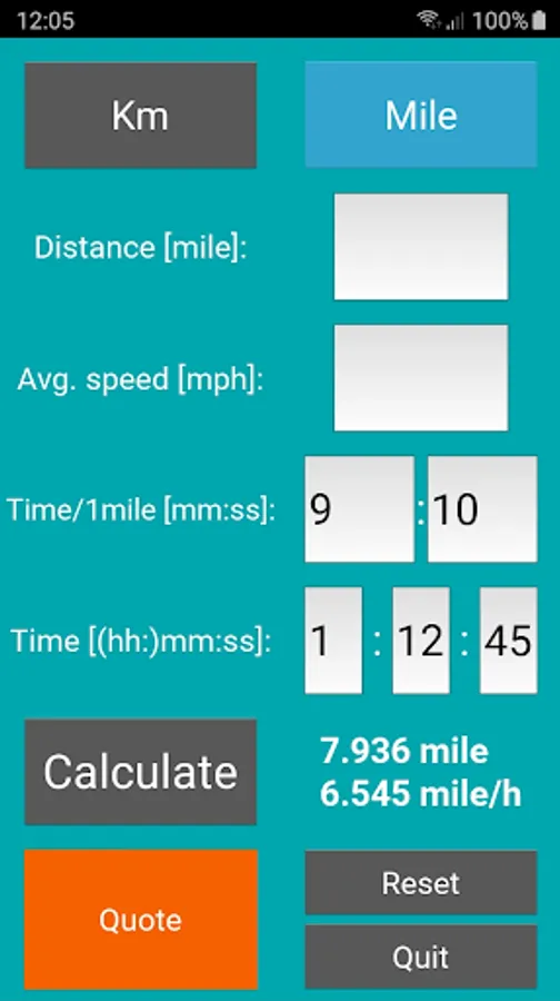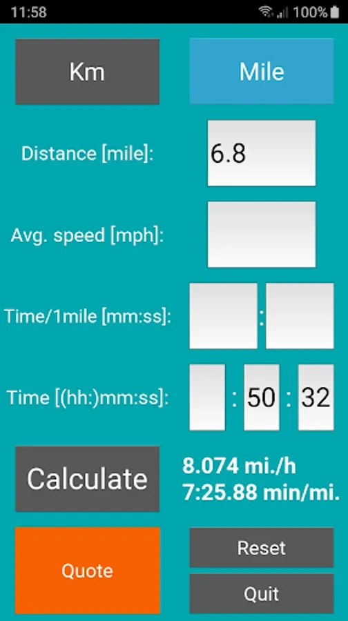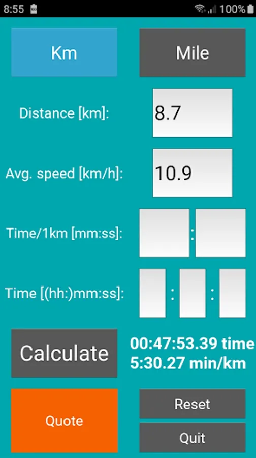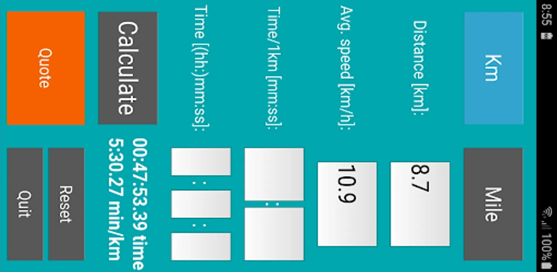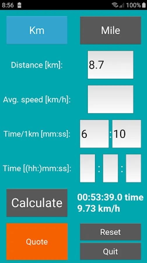 You can calculate distance, average speed, 1km/1mile time and total running time from 2 input data. Also you can find ~1000 quotes in the app.