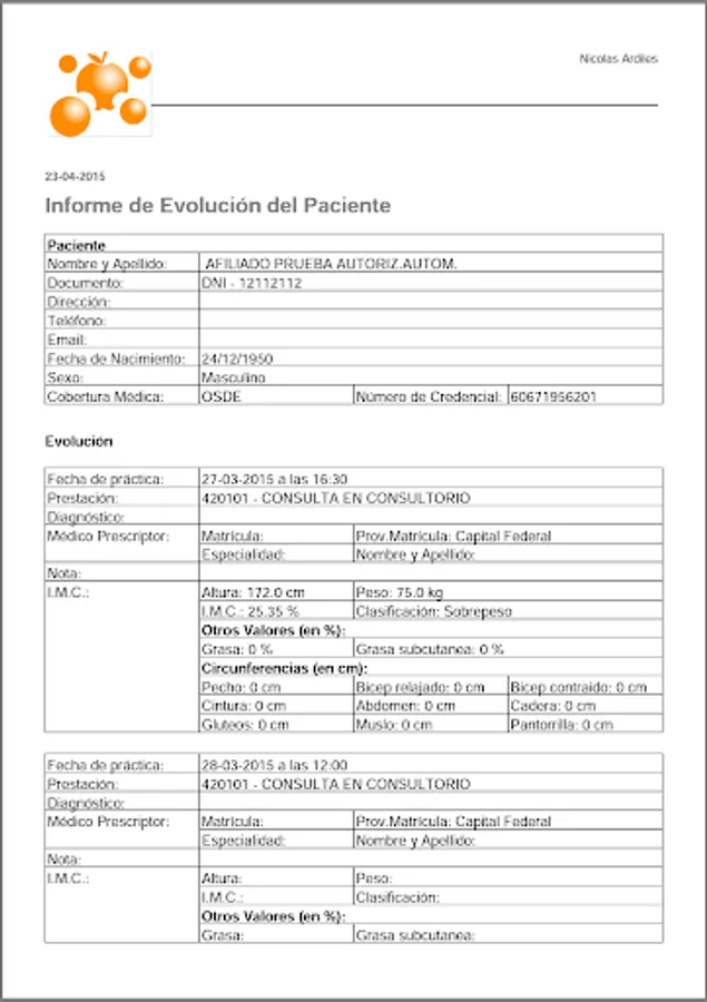 - Display the medical history with the patient's progress along each care performed, puediendo export a report to the patient or to a colleague.