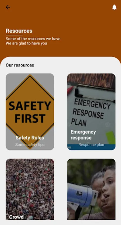 screen opens up to four cards, each containing its own resources. The first card is an emergency card that contains information on what to do in