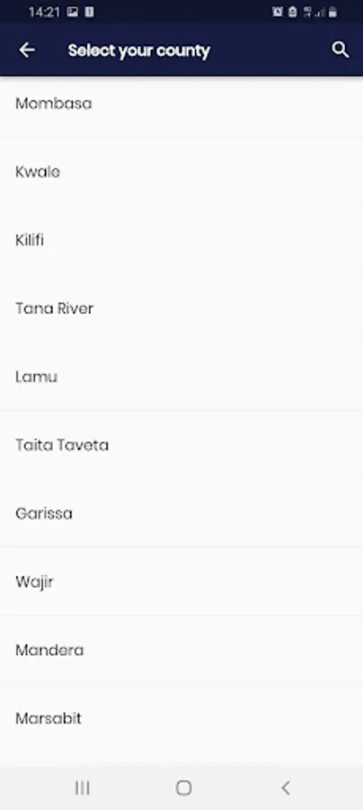 (b) List of Counties - Consists the 47 counties of Kenya from which the user can select depending on where the crime he wants to report is taking place so that he can be led to the screen showing police centers in that county.