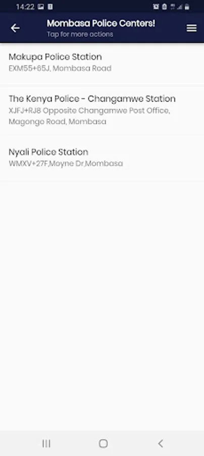 5. Police Centers Screen - When a user clicks on the list of counties and selects the county from which he is reporting, he will be taken to a list of police centers within that specific county, then he/she chooses the nearest police center. There is contact information for each station from which one can choose to call or send a text to make a report on the crime. One can also capture and send a video or images from the scene using the record option; and also provide direction to the crime scene.