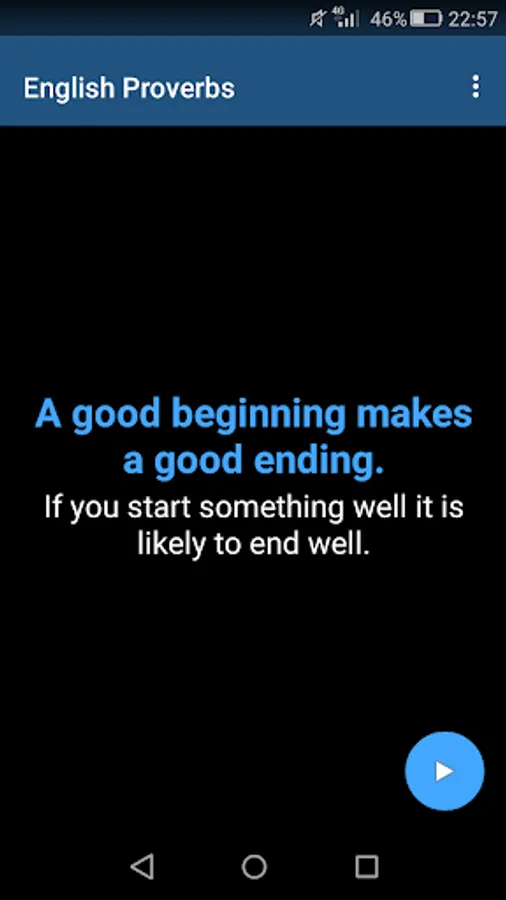 A small collection of English proverbs with audio and proverb descriptions / details. Italian translations are also available. In the settings choose between random and sequential navigation as well as the proverb detail language (English or Italian). Swipe left / right to change proverbs. Press the "play" button to hear the audio.A small collection of English proverbs with audio and proverb descriptions / details. Italian translations are also available. In the settings choose between random and sequential navigation as well as the proverb detail language (English or Italian). Swipe left / right to change proverbs. Press the "play" button to hear the audio.