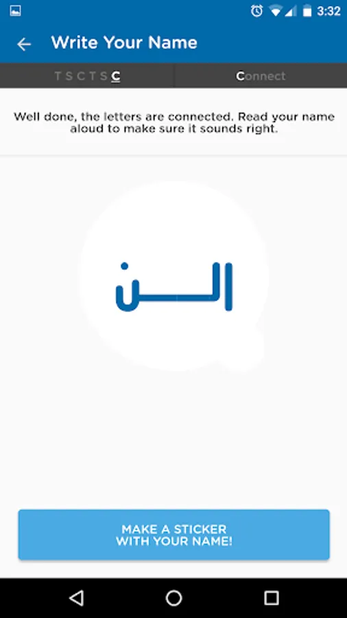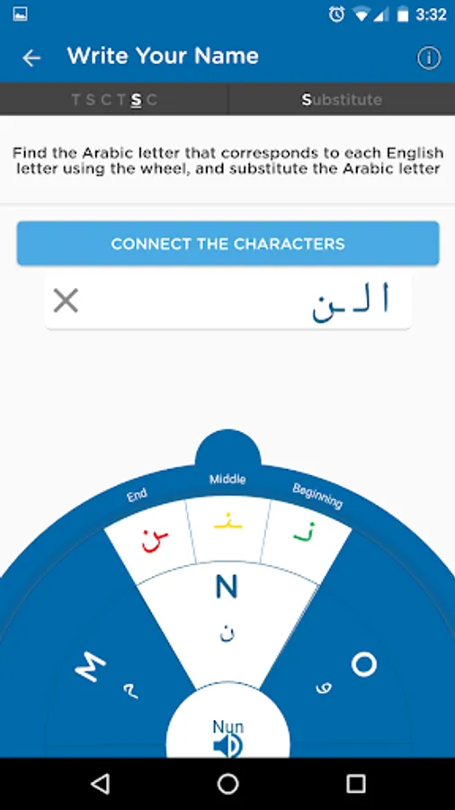 Novice users are guided step-by-step.  Advanced users can opt to go directly to the animated wheel where they can spin and select the Arabic characters to match their English names.