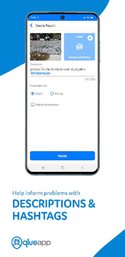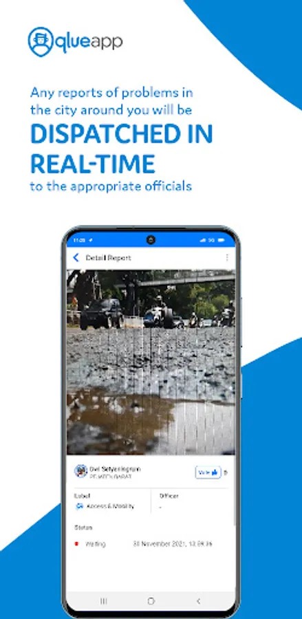 Qlue is a social media app which allows users to report problems directly to the city government and businesses, as well as sharing informations to the neighbors around them in order to help creating Smart City. Reports from citizens will be dispatched in real time to the related officials. Each report's status can be monitored using Qlue App and Qlue’s Dashboard in mycity.qlue.id.