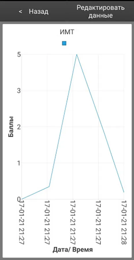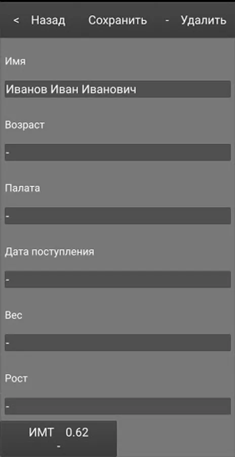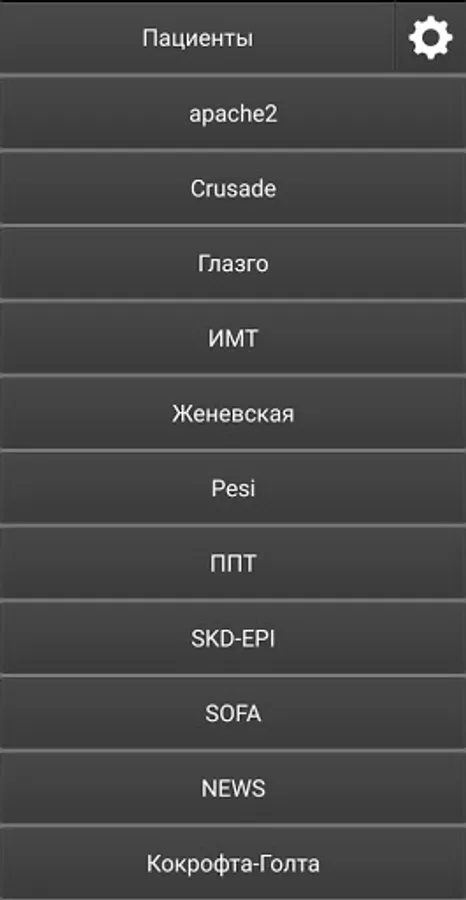 Glasgow Coma Scale, Body Mass Index, Body Surface Area, Crusade, Geneva, Pesi, SOFA, SKD-EPI, apache2, NEWS. It is possible to save the received data by the patient's full name, if necessary, it is possible to save data on age, height, weight, date of birth and admission and room number. The patient's window displays the latest received data for each scale, it is possible to view all data for each scale in the form of a graph, delete each received value separately and view the date of receipt of each specific value.