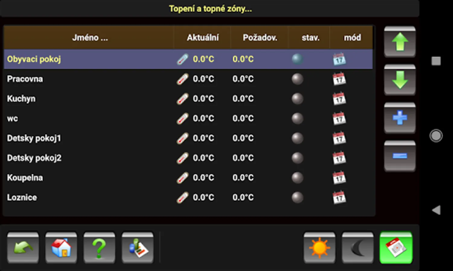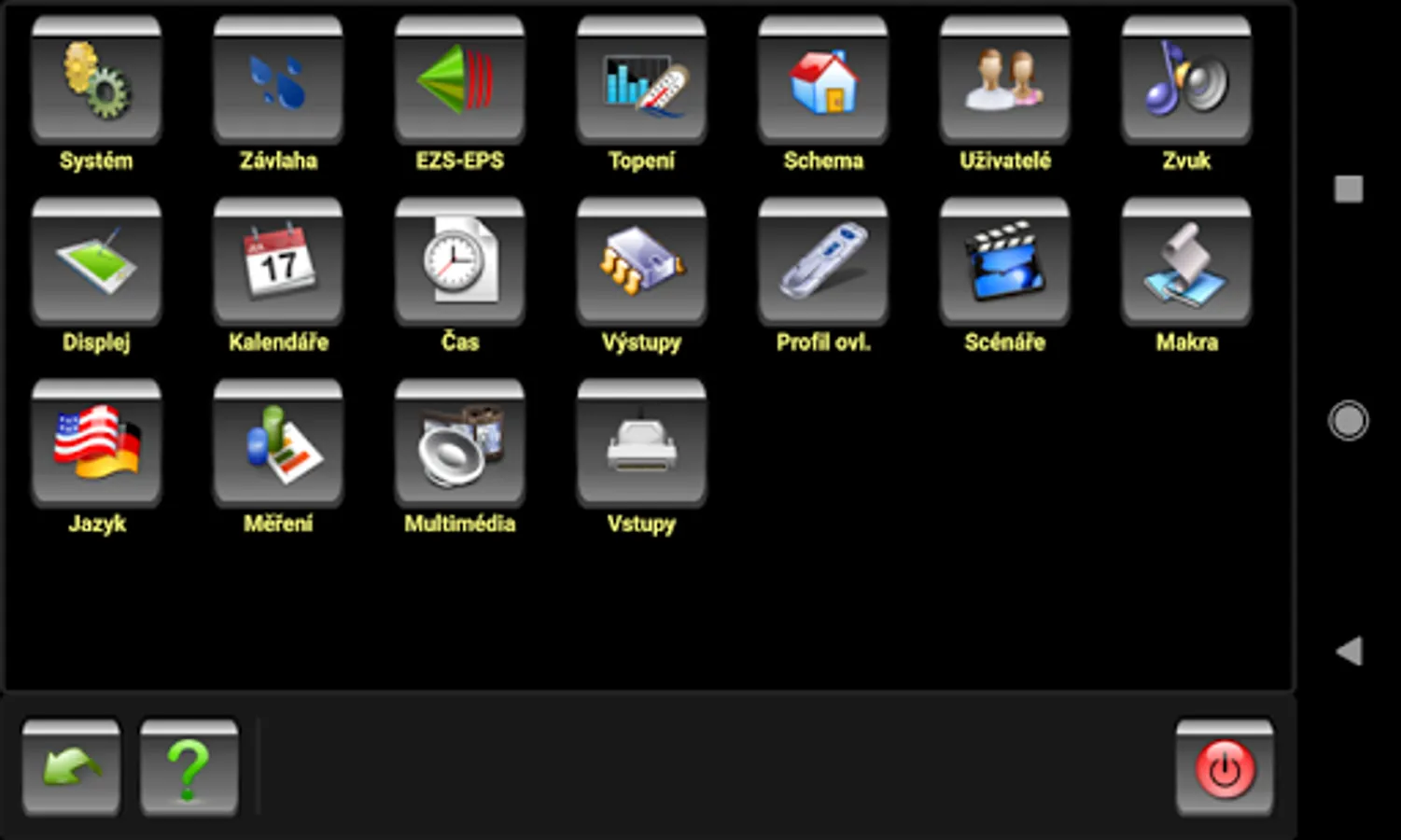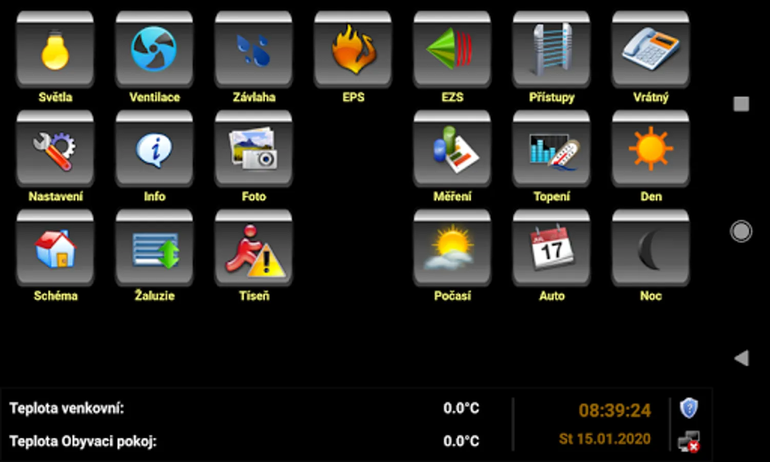 The control panel shown allows you to control individual home systems using the buttons. In the following layers, the individual systems of the house can be viewed, controlled and possibly configured.