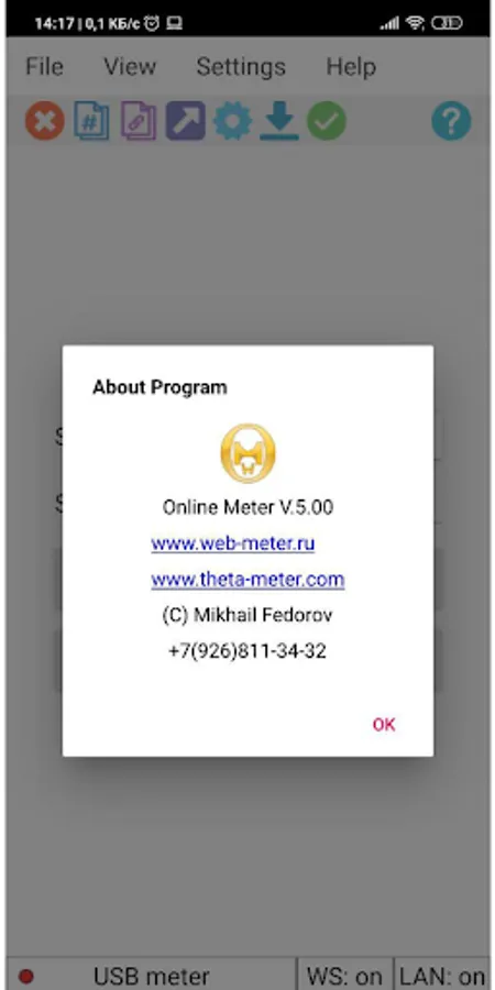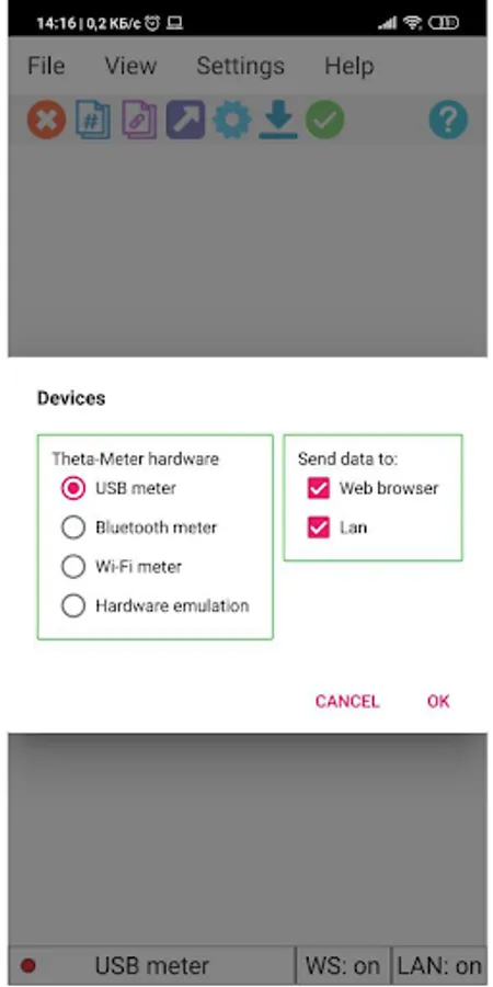 The program receives data from a Theta-Meter connected to a tablet or phone via the Bluetooth or Wi-Fi interface and, using a remote server, transfers them to another user's computer, tablet or phone to see the Theta-Meter device readings on it.