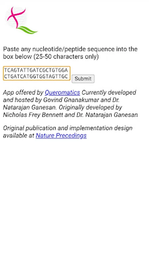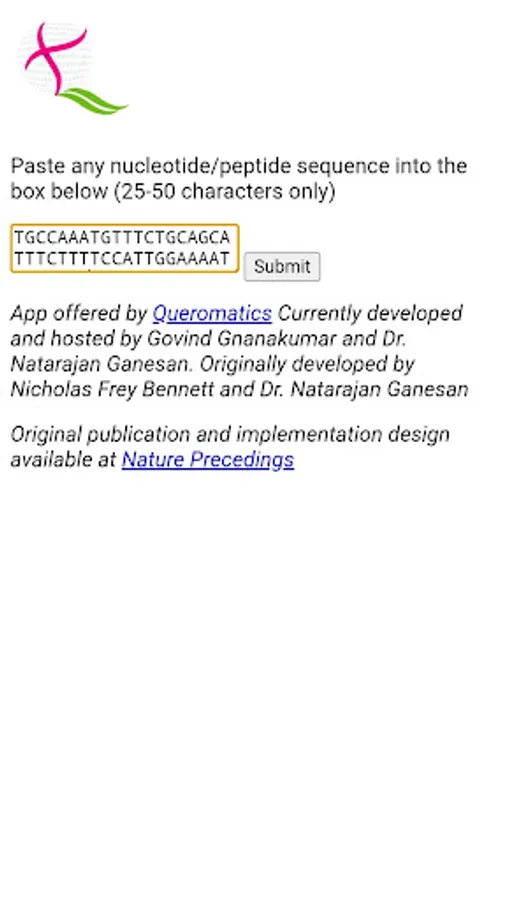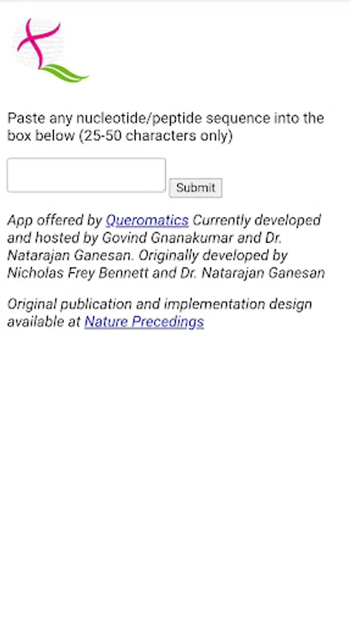 The success of retrieval of searches from the input code is vastly enhanced using the Instaseq app. Direct input of a nucleotide or peptide sequence into a search engine is most likely to return no results. Instaseq processes the query into short strings in a particular fashion and submits them to the Google search engine. The app then returns links from publicly available pages on the internet.
