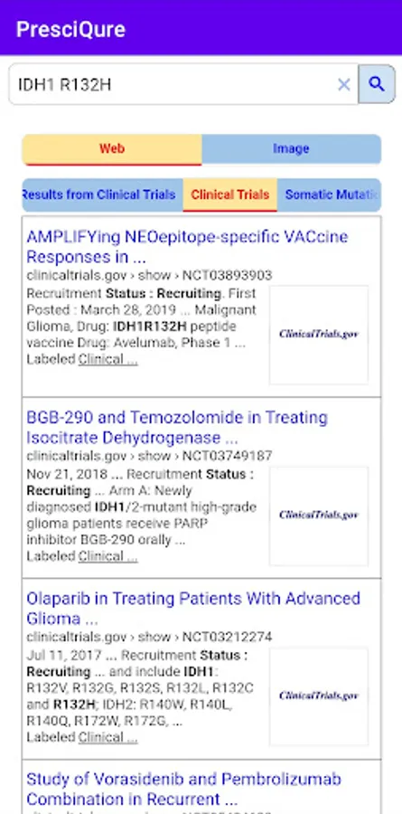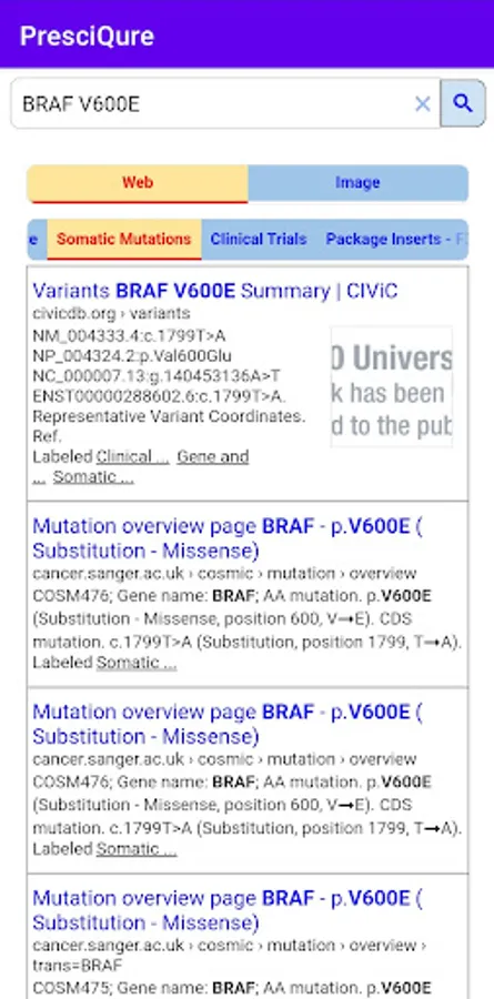 WHAT IS PresciQure - PresciQure is a simple custom search tool that aids greatly in quickly finding this relevant information by looking through curated sources of medical data like the ClinVar, FDA, ClinicalTrials.gov, COSMIC, CIVic, etc. All of these are presented in one place and the results are categorized on top of the results page.