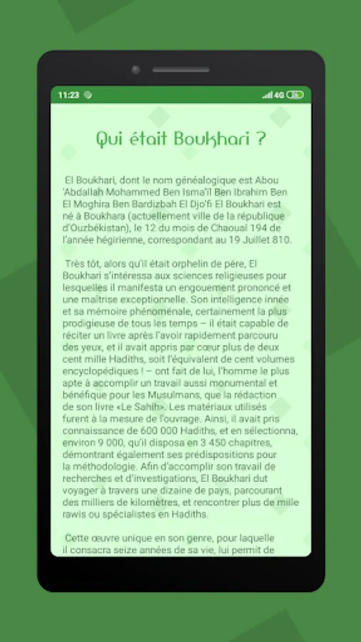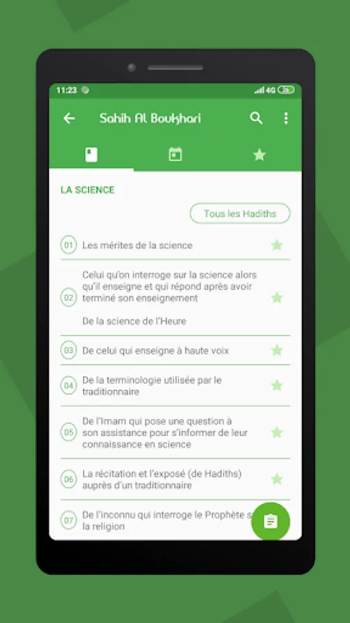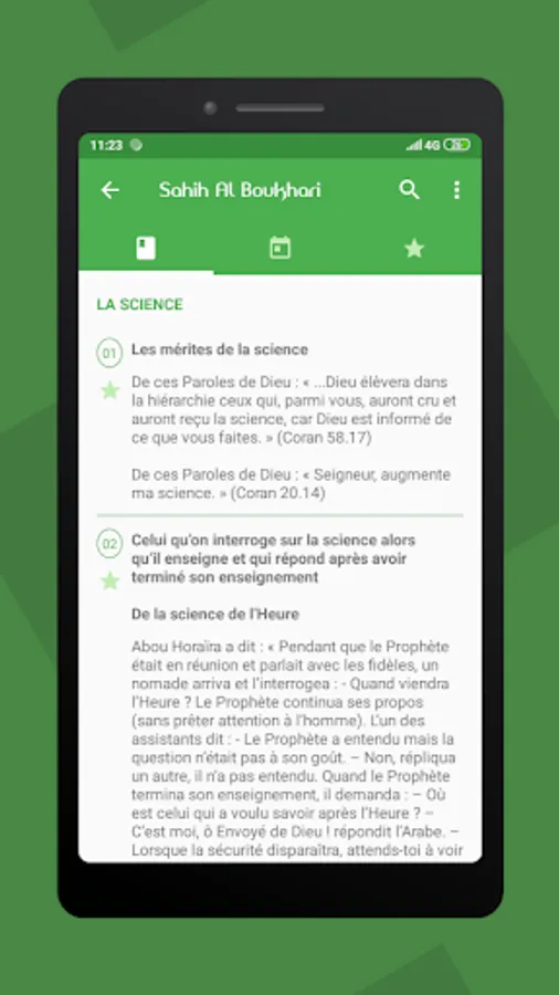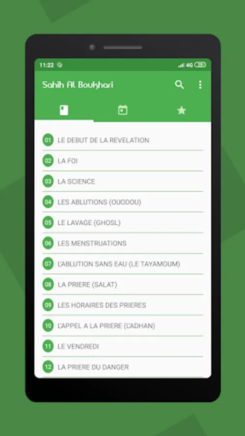 The content of this application is a selection of more than 2000 Hadiths coming exclusively from the book of Mohammed Yacine Kassab "3000 hadiths and Koranic quotes" which is entirely in French because intended for a non-Arabic speaking audience.
