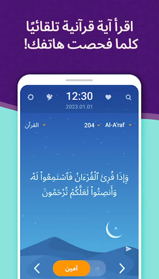 ● (1) It's so simple! When you turn on your phone, a verse from the Quran appears. You can see it verse by verse without any burden. (Once you read a verse, the next verse will appear automatically.)
