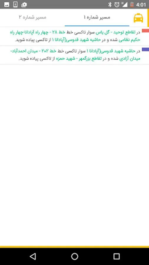The service is based on the travel route by car to the metropolitan road network of the user. User your desired destination on the map and good directions to reach the destination via the Internet of central server and drawn on a map. Description stepwise path in describing the path is available to the user. The user may ride on your personal car or taxi use exclusively for traffic. In the latter case the deliberate abuse of this service in addition to the user guide will be unfamiliar to tourists and travelers.