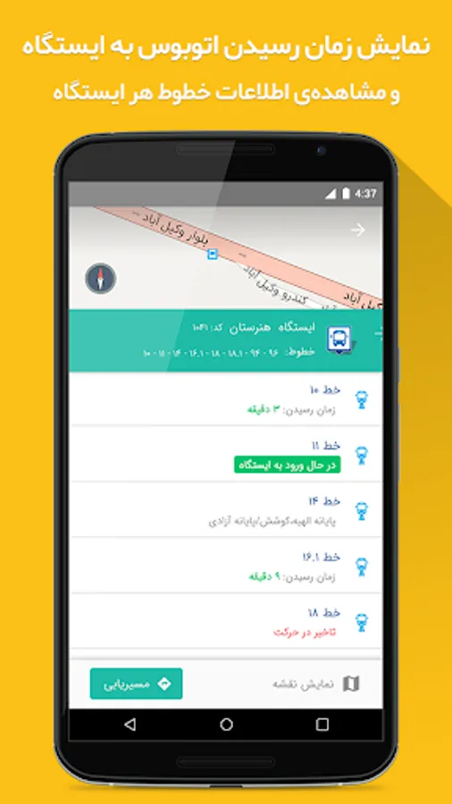 Mashhad traffic and transportation map targets citizens, pilgrims and tourists of mashhad and tries to help them in urban travels by displaying information about current status of transportation. Never be blocked in traffic jams by checking traffic status of your route before departure. You can also find best routes of public transit to reach your destination efficiently.