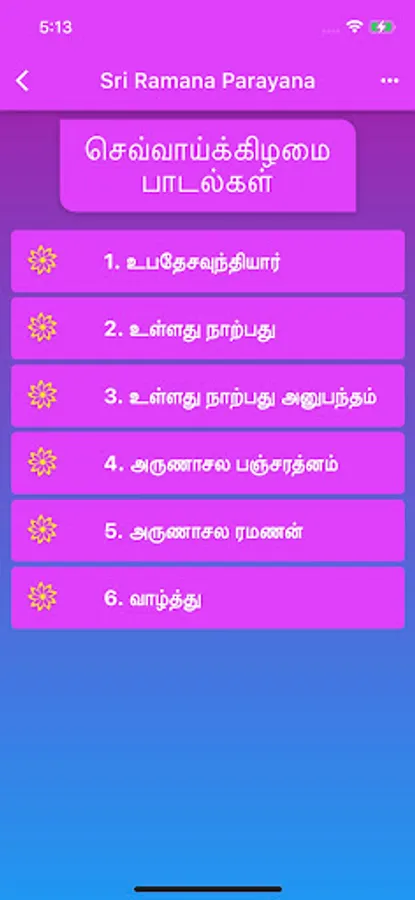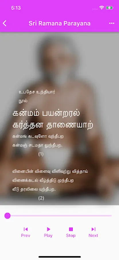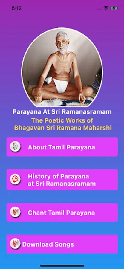 This app contains the parayana (chanting) of Tamil verses conducted daily at Sri Ramanasramam, Tiruvannamalai. The parayana are the poetic works of Sri Ramana Maharshi. The recitation of these works at Sri Ramanasramam started in 1920 and continues to the present day at the ashram. For the ease of the devotees, English transliterations of the verses are provided along with the original Tamil verses. Like mantras, these skillfully crafted verses work on the mind of the person in a mysterious and powerful way bestowing understanding and wisdom on the reader.