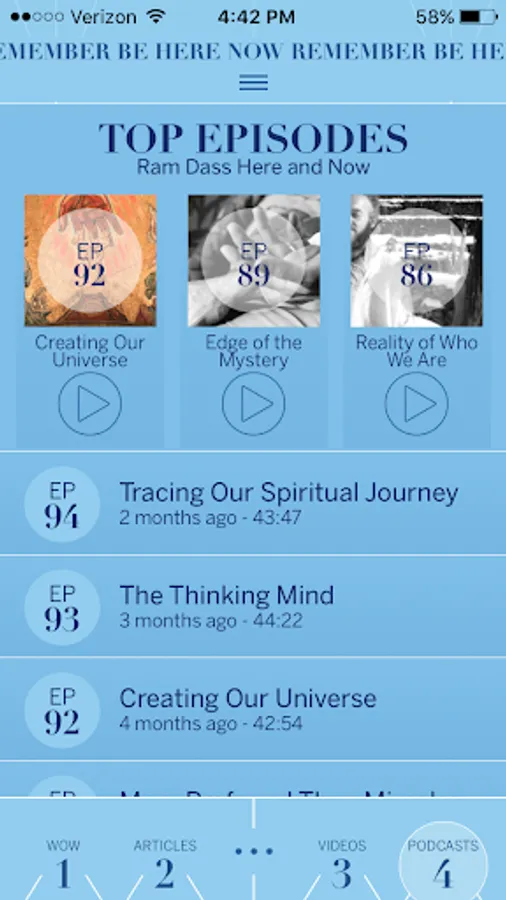 - Access to over 100 audio podcasts from Ram Dass' 50+ years of teaching with an easy-to-use audio player.