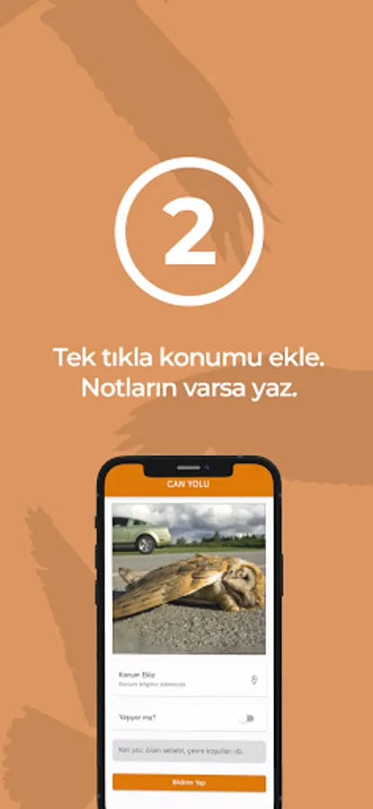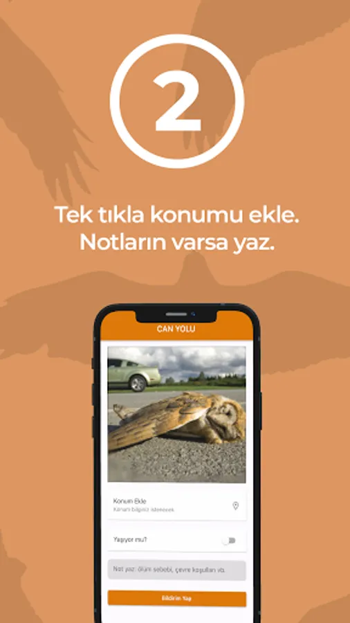 Life Path is a citizen science application where users can report threats against all wild animals, especially birds of prey. With a few simple and quick steps, the user can recover from vehicle crash, gunshot injury, poisoning, etc. It shares the photo and location information of wild animals that lost their lives or injured due to reasons. All these collected data will be processed within the scope of the Predatory Birds Protection Movement project and will be used in the development and updating of protection plans for wild animals. The application is not intended to respond to emergency calls. The Raptors Conservation Action: Act II is a conservation project supported by Rufford Small Grants and coordinated by the Biodiversity Studies Association. For detailed information, you can visit: raptorsconservation.org.