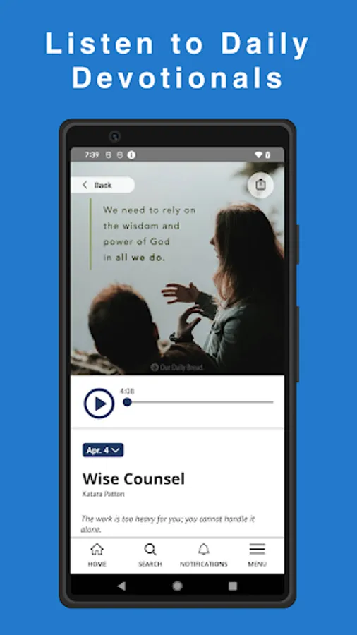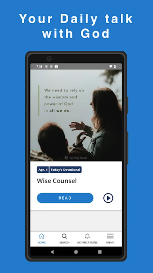 The Our Daily Bread devotional is read by millions of people around the world and encourages people to spend time with God every day. Join the Our Daily Bread community in growing closer to Christ. Daily readings are available in many languages, including English, Afrikaans, Simplified Chinese, Traditional Chinese, Dutch, French, German, Hindi, Indonesian, Italian, Japanese, Malay, Myanmar, Polish, Russian, Spanish, Sinhala, Tamil, Thai, Ukrainian and Vietnamese.
