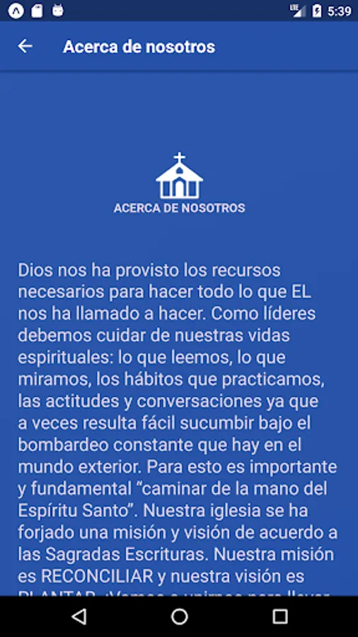 This mobile App has been designed to provide members of the First Charismatic Church of Meriden in Connecticut USA, a tool that allows them to have immediate access to church information, such as: mission, vision, location, numbers and media contact, the monthly calendar of activities and a photo gallery that allow us to recall the work that God has done, does and will continue to do in our midst.