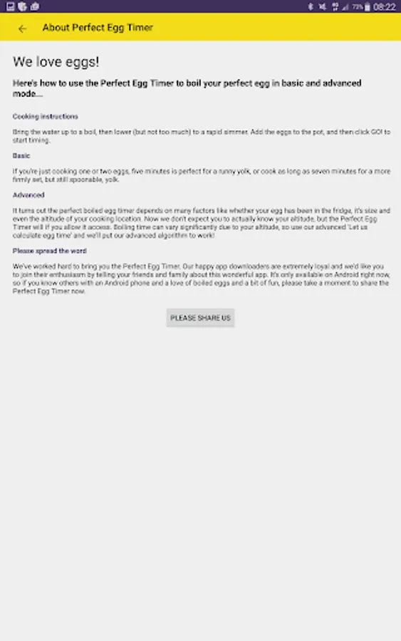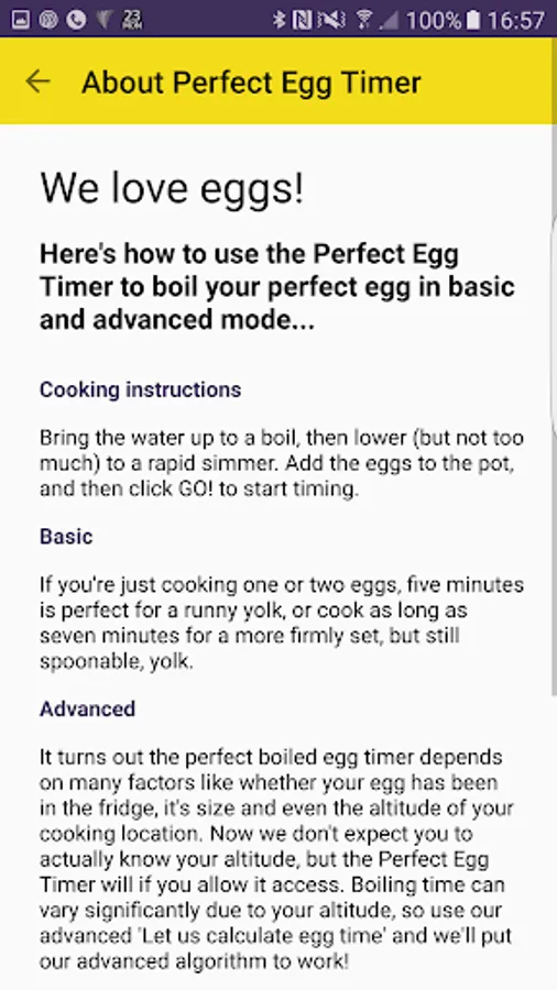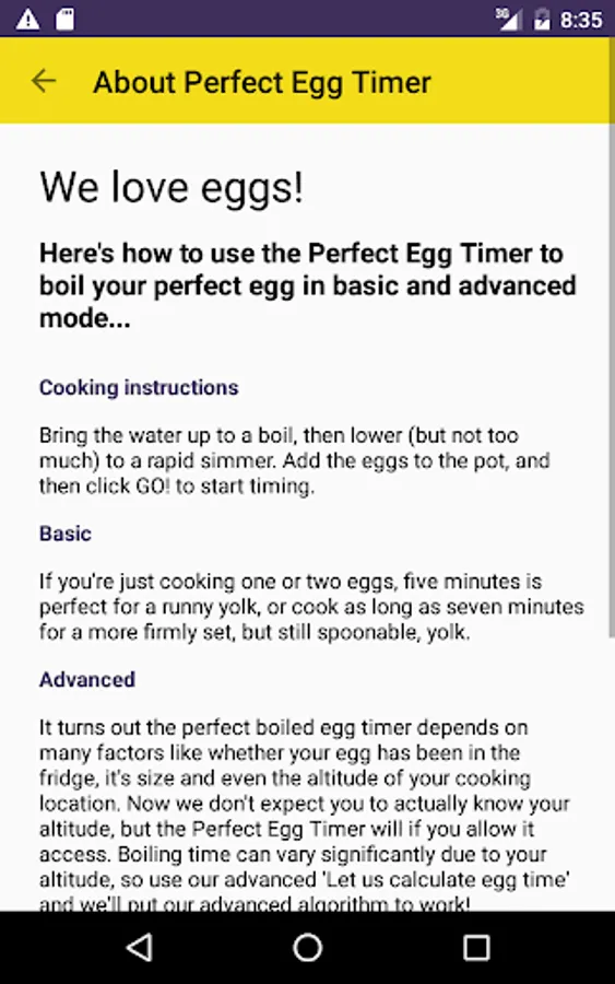 - ADVANCED MODE: Let the Perfect Egg Timer calculate your egg boil time with our unique algorithm!