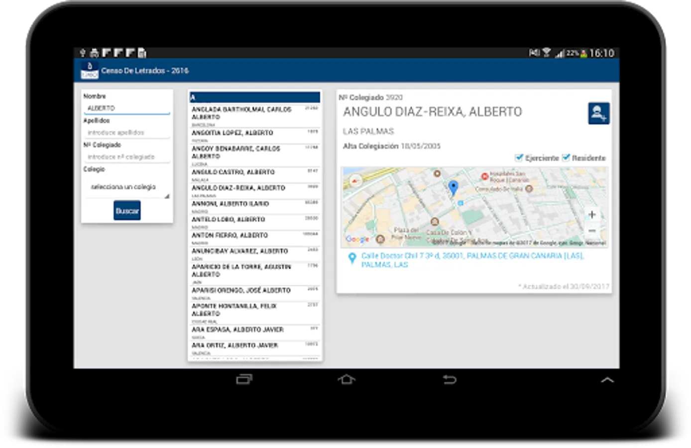 Offers access to business data from any collegiate Lawyers in national territory, without having to call or navigate to your Bar Association, the Bar Association of interest or the General Council of the Bar.