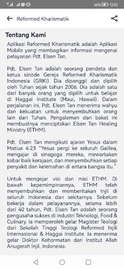 To pursue ETHM's vision and mission, under his leadership, ETHM has healed and preached the Gospel throughout Indonesia and its surroundings. Prior to working in his ministry, for more than 40 years, Pdt. Elsen Tan is a successful entrepreneur in the Technology, Food & Culinary Industry. He holds a Master of Theology degree from the International Evangelical Reformed Theological College & Haggai Institute. He received an honorary doctorate degree from the God of the Bible Institute, Indonesia.