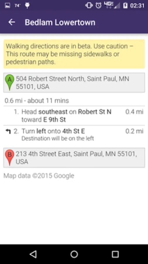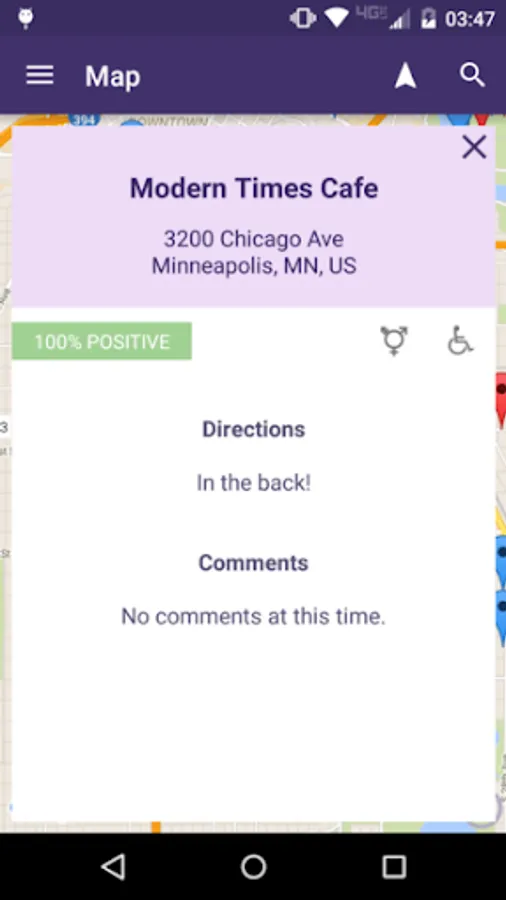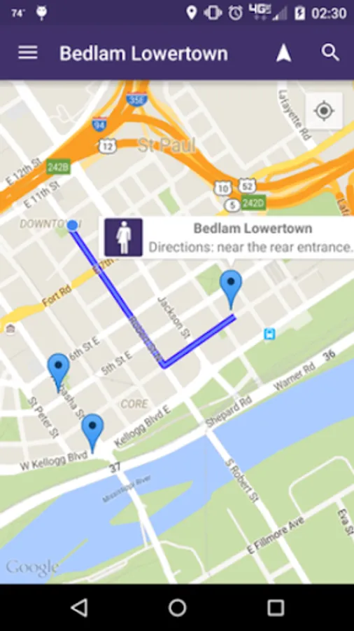 - Tap a map pin to see more information about a restroom, and be given directions to that restroom.