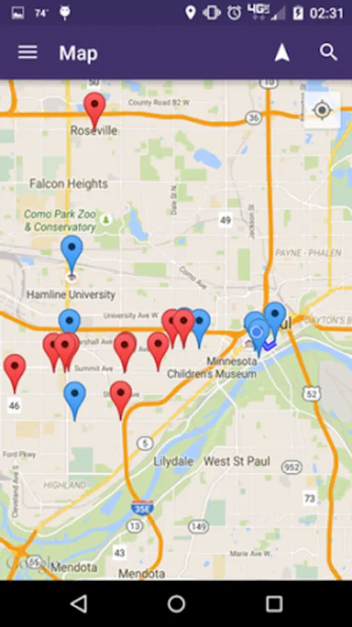 - Blue map pins = handicap accessible restrooms, red map pins = not handicap accessible.
