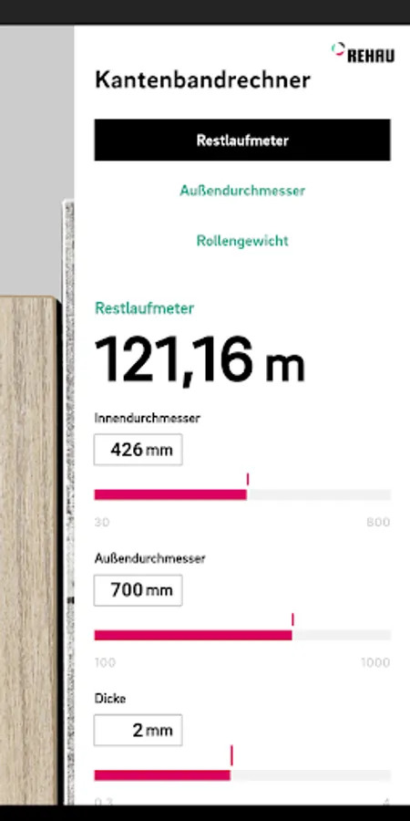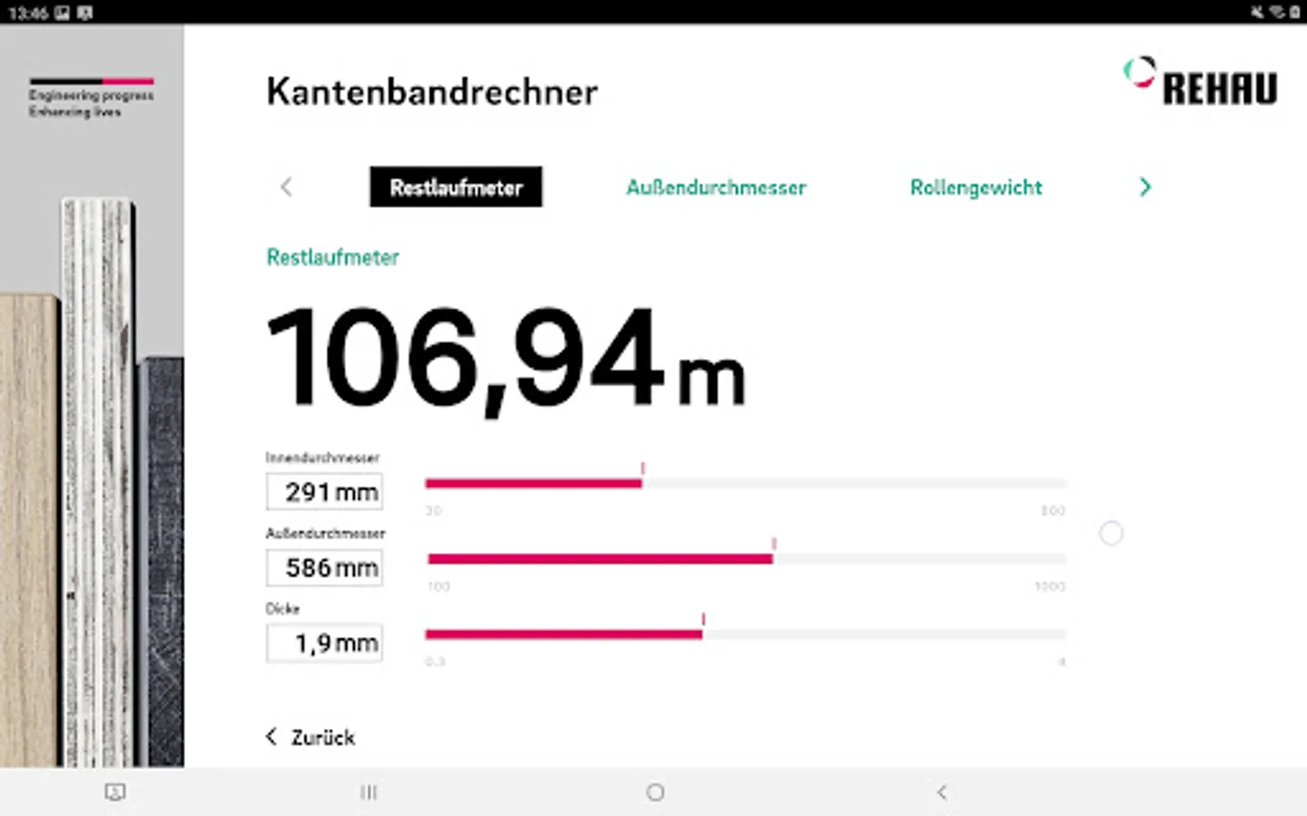 - Use the edge calculator to calculate the remaining running meters, the outer diameter of the roll or the weight