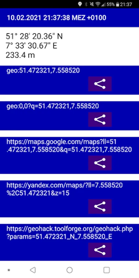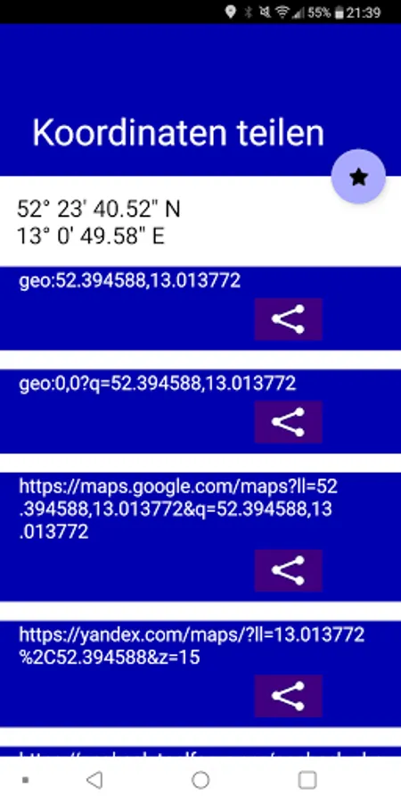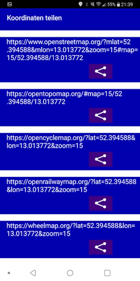 Get a bunch of links to show your actual coordinate in different map services or share your coordinate with other apps oder people (via messenger).