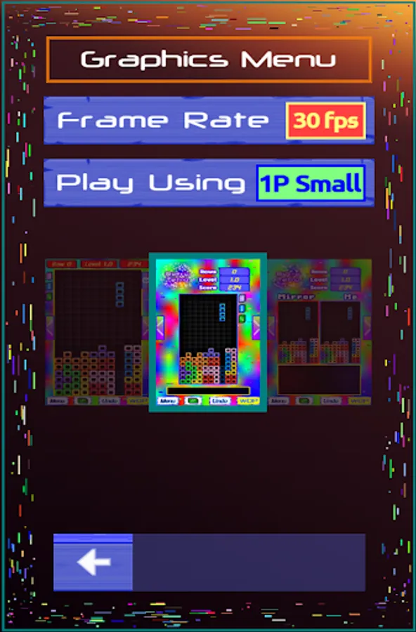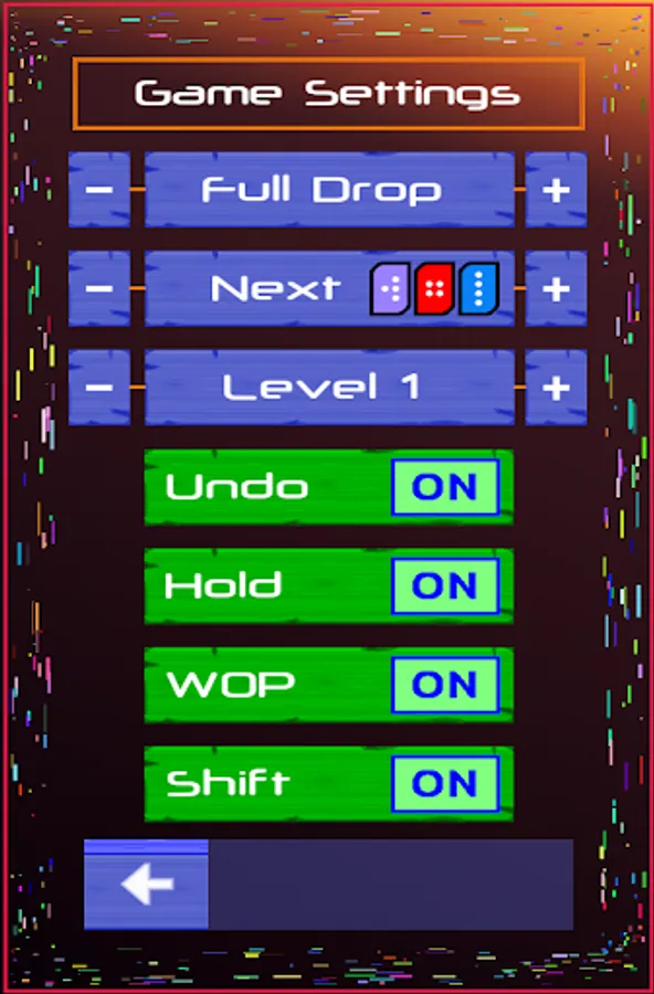 All modes support: Enable / disable most game features before or during game play. Begin at a custom level (1 to 50). Use custom drop modes: (1) normal, (2) slow, or (3) no drop (for causal / relaxing play). Traditional controls for sound, effects, and graphics performance. Customize piece appearance before or during game play.