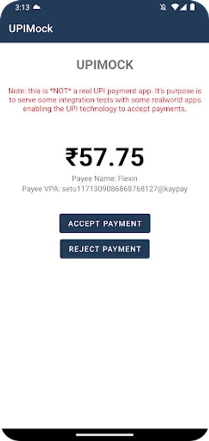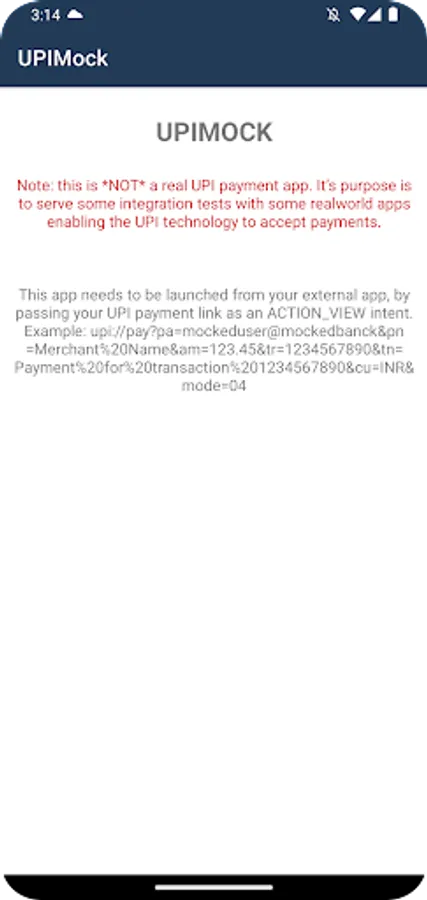 This sample app lets you test your payment integration. It naturally acts with a mocked payment processor on which you have the choice to either accept or reject a UPI payment, and handle the result to your original app.