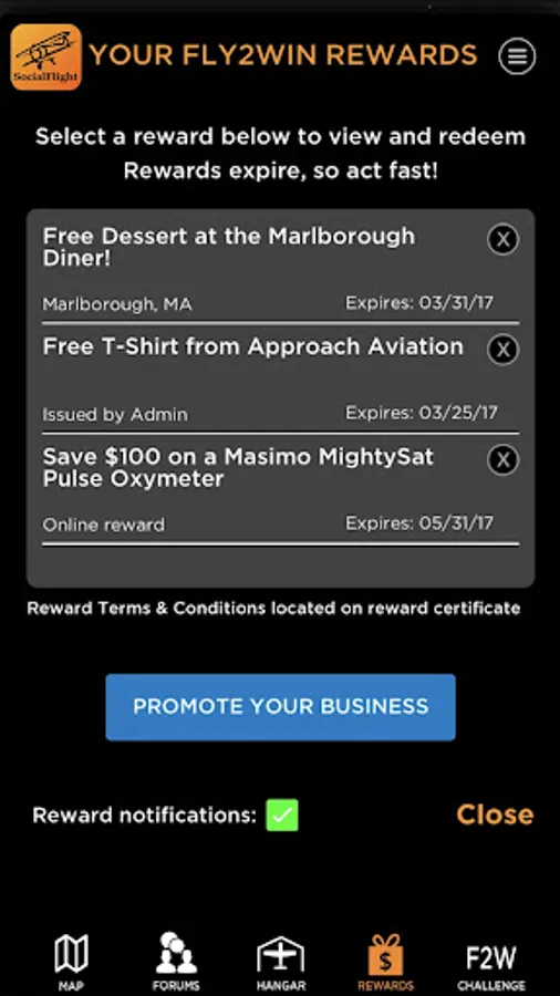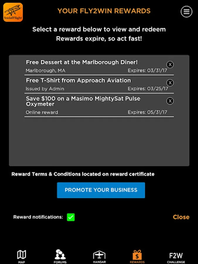 FLY2WIN Rewards: Get special deals, discounts and offers from local businesses and SocialFlight partners. You automatically get rewards based on your location as you travel. SocialFlight also has a new, easy to use, user interface! Best of all, it's all FREE!