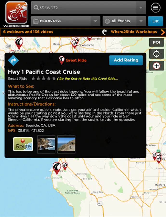 Where2Ride also makes getting "Social" easier than ever before. Find other users with similar bikes or interests. Chat with other users, form clubs & even share photos!