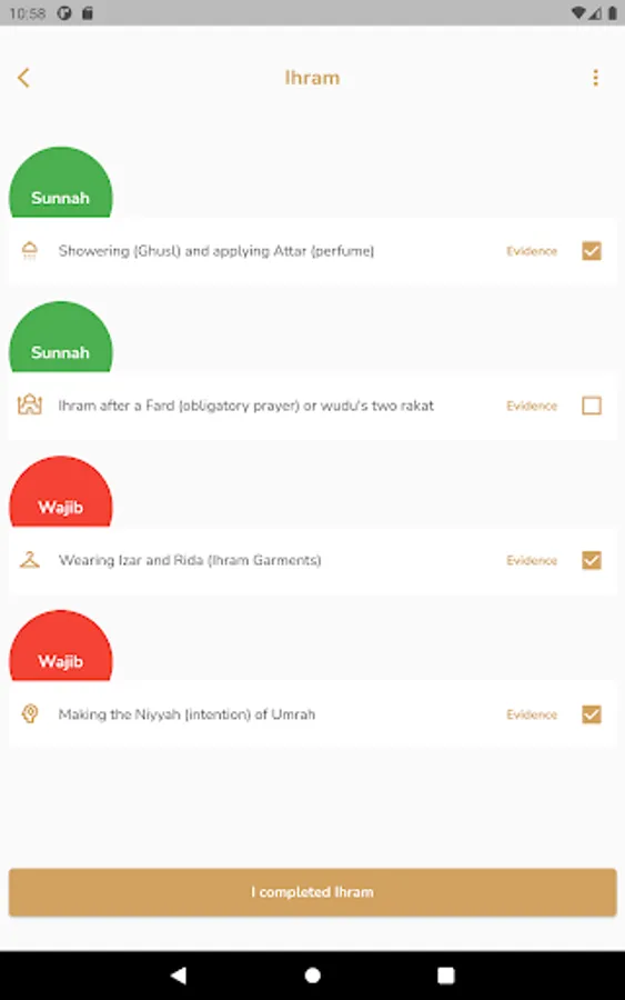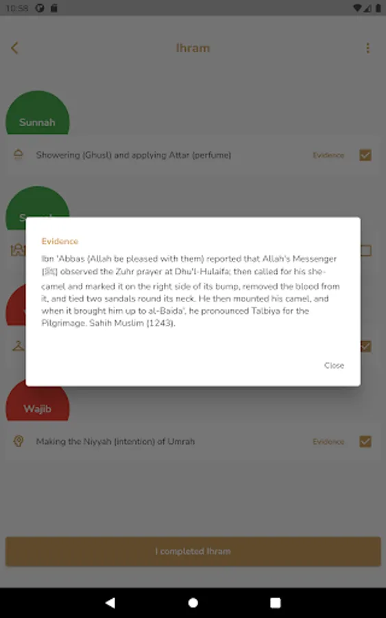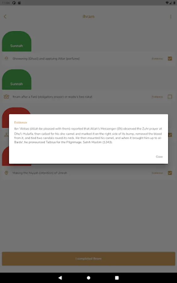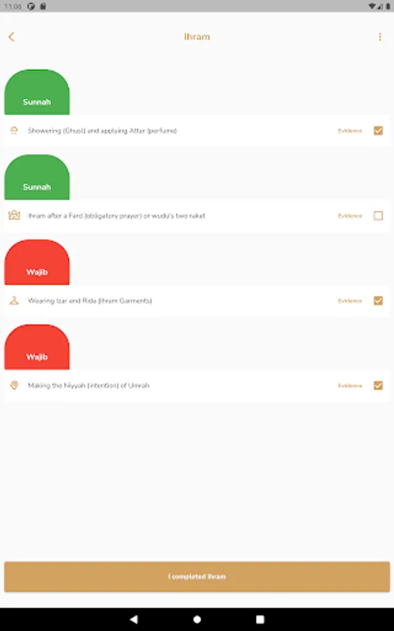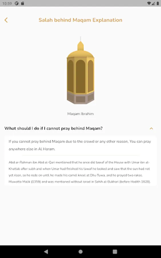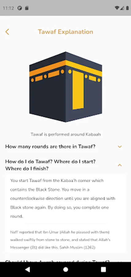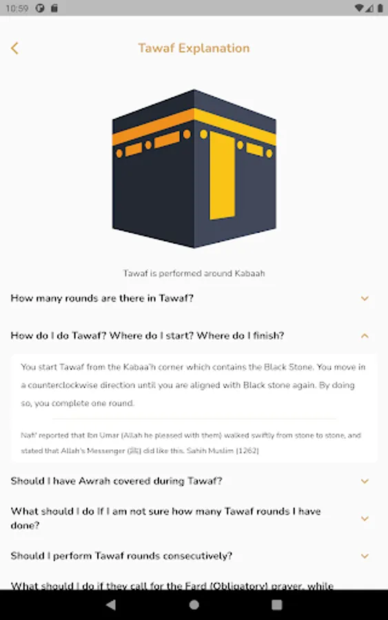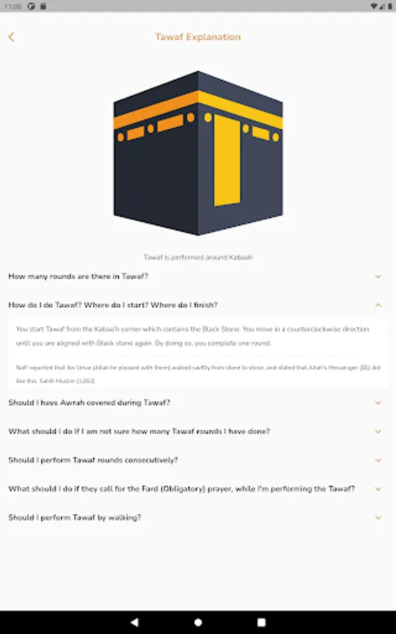 Umrah Tracker guides you in performing umrah at every stage of the ritual with checklists and counters. It ensures that you remain on track and do not miss important steps. For tawaf and sa’i, there is a counter to show your progress, thus minimizing the possibility of losing the count of the rounds.