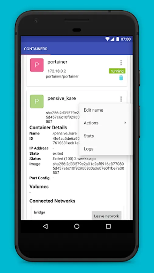 → Ability to perform various actions against containers: edit name, start, stop, kill, restart, pause, resume